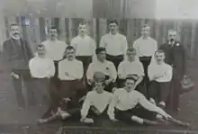 Formed in 1884 by a group of old boys of Wyggeston School as "Leicester Fosse", the club joined The Football Association (FA) in 1890.[9] Before moving to Filbert Street in 1891, the club played at five different grounds, including Victoria Park south-east of the city centre and the Belgrave Road Cycle and Cricket Ground.[10] The club also joined the Midland League in 1891, and were elected to Division Two of the Football League in 1894 after finishing second. Leicester's first ever Football League game was a 4–3 defeat at Grimsby Town, with a first League win the following week, against Rotherham United at Filbert Street. The same season also saw the club's largest win to date, a 13–0 victory over Notts Olympic in an FA Cup qualifying game.[3] In 1907–08 the club finished as Second Division runners-up, gaining promotion to the First Division, the highest level of English football. However, the club were relegated after a single season which included the club's record defeat, a 12–0 loss against Nottingham Forest.[3][11]