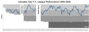 City reached the FA Cup final for the first time in their history in 1949,[3][17] losing 3–1 to Wolverhampton Wanderers. The club, however, was celebrating a week later when a draw on the last day of the season ensured survival in Division Two.[18][19] Leicester won the Division Two championship in 1954,[20] with the help of Arthur Rowley, one of the club's most prolific strikers. Although they were relegated from Division One the next season, under Dave Halliday they returned in 1957,[21] with Rowley scoring a club record 44 goals in one season.[12] Leicester remained in Division One until 1969,[22] their longest period ever in the top flight.