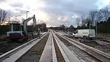 Site clearance for the dedicated busway section between Leigh and Ellenbrook took place between November 2012 and March 2013.[49] Balfour Beatty began its construction in September 2013.[50] A short section of the busway west of Newearth Road was completed in early 2015 and in the April was used for a trial of the construction method and the bus guidance system. Following delays due to bad weather and other problems, the busway works were rescheduled to be completed before the end of 2015. The service began on 3 April 2016[35] to coordinate with associated road and tram works in Manchester city centre.[51][52]