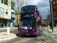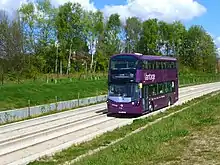 Services were initially operated by 20 Wright Eclipse Gemini 3 bodied Volvo B5LH hybrid double-decker buses in purple-livery. They are equipped with CCTV and next stop audio and visual announcements, USB charging points and free Wi-Fi.[35] Five more buses were purchased in January 2017 to provide extra capacity at busy times and facilitate the extended service to Central Manchester Hospitals.[10][36] It is required that buses that operate the busway service are replaced after 5 years of service. Further buses are scheduled to enter service in September 2018. These will operate the V4 service from Ellenbrook, and will be standard vehicles not adapted for busway running.[37]