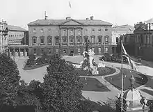 Leinster House was the former ducal residence in Dublin of the Duke of Leinster, and since 1922 served as the parliament building of the Irish Free State, the predecessor of the modern Irish state, before which it functioned as the headquarters of the Royal Dublin Society. The society's famous Dublin Spring Show and Dublin Horse Show were held on its Leinster Lawn, facing Merrion Square. The building is the meeting place of Dáil Éireann and Seanad Éireann, the two houses of the Oireachtas, and as such the term 'Leinster House' has become a metonym for Irish political activities.