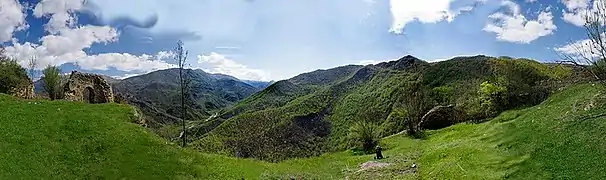 One of several castles in the highlands of Kalbajar, Handaberd was constructed over the Ayrım Gorge, on a high mountain ridge surrounded by thick forest, 600 metres (2,000 ft) from the right bank of the Levçay River flowing by Ganlykend village.[3] Handaberd is first mentioned as "Handu berd" by the 10th century Armenian historian Movses Kaghankatvatsi, who wrote in his work History of the Country of Albania that the fortress was built by Prince Atrnerseh of Khachen in the second quarter of the 9th century.[1] Atrnerseh, a member of a branch of the Siunia dynasty, ruled over an area approximately corresponding to the historical Armenian province of Artsakh.[2] Handaberd was located in the Tsar province (also known as Upper Khachen) of the Principality of Khachen․[1] It served as Atrnerseh's residence as well as a prison for prisoners sentenced to death.[4]