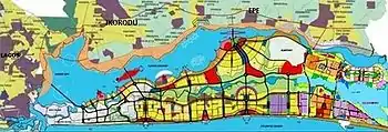 In 2006, the Master Plan of Lekki Free Trade Zone, covering a total area of 155 square kilometres at the easternmost end of the peninsula, was initiated and prepared by the State Government of Lagos. The Plan defined the free zone as a special multi-functional economic zone and a new modern city with several south-west and north–south traffic corridors. Later in July 2008, the blueprint of developing the entire Lekki Peninsula into a 'Blue-Green Environment City' was proposed by the state Government, which covers an additional area of 600 square kilometres.[2][1] The Lekki City plan was prepared by Messrs Dar al Handersah, Shair and Partners, for Lagos State Ministry of Urban Planning and Physical Development.[5]