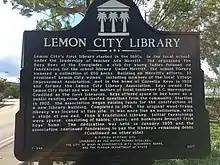 During this time, the library association's valiant effort served to grow the number of monetary contributions received through fundraising events, as well as the available number of furnishings and books for the collection itself. Construction of the library began in 1904 and found a home at 412 N.E. 61st Street in Lemon City. The formal dedication ceremony for Lemon's City Public Library took place on January 13, 1905. The library served Lemon City residents for several decades, and became part of the Miami-Dade Public Library System in 1942. In 1963, the library was scheduled to close and after a fire caused severe damage to the structure; it was decided that a new Lemon City Public Library would be built. On April 13, 1964, the newly built Lemon City Public Library officially opened and has remained open at its current location ever since. A plaque placed beside the library marks the site as a Florida Heritage site and commemorates the history of the library, serving as a reminder of its original location, and the efforts of those enterprising individuals who strove to make the library a reality for the residents of Lemon City.[9][10]