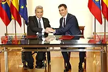 He was nominated as the candidate for Correa's PAIS Alliance, a centre-left, democratic socialist[1] political party, in the 2017 presidential election and won a narrow victory in Ecuador's second round of voting on 2 April 2017.[2] However, after his election Moreno drastically shifted his political stance, distancing himself from Correa's leftist legacy and making neoliberal changes to both domestic and foreign policy.[3][4]
