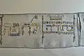 The Lengnau mappot span almost three centuries, from 1655 to 1906. The width of the fabric ribbons in the collection ranges from 10 cm to 24 cm. The length is typically between two and three and a half metres.[1] The wimpels are embroidered or painted with decorated Hebrew letters in Ashkenazi square-script.[2] The wimpels from before 1854 are embroidered, after that they are mostly painted.