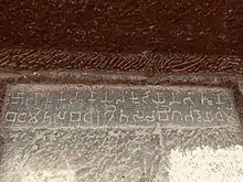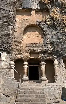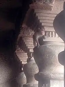 The Satakarni period pillars begin with a four-plated pyramid structure, then a waterpot base, followed by an eight-sided shaft, above a reversed pot, then a capital in five plates, and on the top the amalaka or cogwheel pattern. The capital has animal figures like lions, elephants, a sphinx and tigers. Parts of the pillar are broken. Behind the relic-shrine, are six eight-sided pillars, arranged in a curve. "The stupa consists of a drum with a moulding below and railing above, a globular dome and a corbelled (with "a projection jutting out from a wall to support a structure above it")[21] dome with a railing at the base." The stupa has Buddhist tridents carved on it. A hole is carved for fixing garlands in the front and 5 holes on the top probably to fix a central wooden umbrella and side flags. A 2nd century, swastika-flanked inscription on the back wall of the veranda translates: "A meritorious gift of a chapel cave by the distinguished Sulasadata, son of Heranika of Kalyana [modern Kalyan near Mumbai]."[1][3]