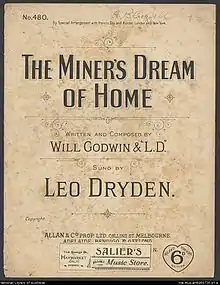 Will Godwin and Leo Dryden wrote The Miner's Dream of Home in 1891. Leo Dryden sang it in the music halls for many years and recorded it on August 27, 1898 on a Berliner cylinder E2013[6]