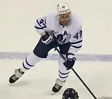 Komarov would rebound the next season and excel under new head coach Mike Babcock. Komarov, who previously played on Toronto's second, third lines and fourth lines, was now experiencing top line duties (taking Phil Kessel's spot), and occasionally reprising his role on the second. He led the Maple Leafs in goals and points up to the Christmas break. Shortly after, he was named to the 2016 NHL All-Star Game on 6 January 2016.[7] Komarov had 27 points in 37 games when named an All-Star, including 15 goals, and was one point behind teammate James van Riemsdyk for the team lead in scoring.[8] Given Komarov's reputation and traditional NHL role as a bottom six grinder, he had not expected to be named an All Star, going as far as to book a vacation during the All-Star break, which was cancelled after he had been named to the festivities.[8] Komarov's production declined in the latter half of the season, partially due to the loss of van Riemsdyk in January to injury. Despite this, Komarov finished the year third in team scoring with 36 points, behind only P. A. Parenteau and Nazem Kadri. The following season, he shared a line with Kadri and rookie winger Connor Brown. In 2017, Komarov played in the NHL Centennial Classic where he scored one goal in Toronto's 5–4 overtime win against the Detroit Red Wings. In 2018, Komarov played in the 2018 NHL Stadium Series against the Washington Capitals, where the Leafs lost 2–5.