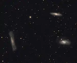 The Leo Triplet (also known as the M66 Group) is a small group of galaxies about 35 million light-years away[5] in the constellation Leo. This galaxy group consists of the spiral galaxies M65, M66, and NGC 3628.
