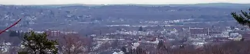 Leominster is primarily located on a plateau above the Nashua River.[5] The river runs through the eastern proportion of the city and then cuts through the northern part of the city as it meanders towards Fitchburg.[17] Northern and Western Leominster have a more rugged terrain defined by scattered hills.[18] The most prominent hills are both the North and South Monoosnoc Hills in the western part of the city. The South Monoosnoc Hill is the highest point in the town at 1,020 feet.[18] In the 19th century, the south hill was quarried for granite used in home foundations.[18] West of the two hills lies the No town Reservoir and Leominster State Forest. To the east, lies the Monoosnoc Brook which winds through the center of town and was an important power source for early manufacturers.[18]