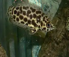 The leopard bush fish (Ctenopoma acutirostre), also known as leopard bushfish, spotted ctenopoma, leopard ctenopoma, spotted climbing perch, spotted leaf fish, spotted cichlid or spotted bushfish, is a freshwater fish. It is a member of the family Anabantidae, which is part of a group popularly known as labyrinth fish (gouramies and relatives).