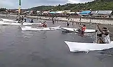 Traditional lepa-lepa canoe is made from single piece of hollowed wood (dugout base). The wood can be of various sizes. They can be used with or without a sail,[1] as they can be propelled with paddles (called wosa in native language) and quant poles (doan).[1][3] Some of them may be equipped with double outrigger. Lepa-lepa may be enlarged by adding additional planks to its sides. A boat that has been added with a kalulis prow is called lepa-lepa kalulis. The sails used are from nade, gaff, and tanja types. After 1980s lepa-lepa began to be modernized by adding outboard motor.[1] Modern lepa-lepa is made by fiberglass.[4] A lepa-lepa may be 3.4-9.3 m long, with 40–80 cm width, and depth of 30–55 cm.[3]