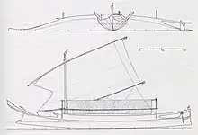 The keel of lepa is made from a shallow dugout known as the tadas or lunas. It is built up along the sides with strakes that are narrower than the keel. An additional three sideboards are joined edge-to-edge to the topmost strake (the gunwales), extending from the stern. They are known as (bottom to top) bengkol, kapi kapi, and koyang koyang. They do not extend fully towards the prow, forming a distinctive gap at the front hull of the ship. The hull tapers sharply at the prow and stern. Like in other indigenous Philippine ships, the hull of the lepa is traditionally fitted together by dowels (tambuko) and fiber lashings instead of nails. A detachable house-like structure (the kubu or balutu) is often built in the center of the hull, with a removable decking known as lantai as the floor. The roof (sapaw) is made with plaited nipa leaves mounted on detachable Y-shaped posts. The portable cooking hearth (lappohan) is located in the stern deck, along with stored food (lutu) and water jars (kibut).[7][1][5]