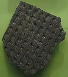 In the 19th century, due to the reptilian look of the diamond-shaped leaf scar pattern, petrified trunks of Lepidodendron were frequently exhibited at fairgrounds by amateurs as giant fossil lizards or snakes.[9] Inversely, the fossil of a temnospondyl amphibian collected in a Triassic formation in Tasmania was described in 1885 as the cone of an ancient plant, with affinities to this genus, as Lepidostrobus muelleri.[10][11]