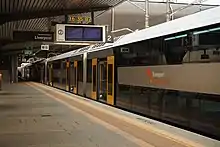 Leppington railway station is the terminus of the South West Rail Link which serves the south-western Sydney suburb of Leppington. It opened on 8 February 2015.[2] A ten road stabling facility is located to the west of the station at Rossmore.[3] There are 850 car park spaces available.