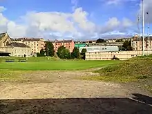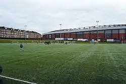 Since Hampden's 1999 redevelopment, a row of Portakabins on the north side of the Lesser Hampden pitch had housed the Queen's Park club offices, with a proposed rebuild of the site as an elite youth development facility never materialising.[1][7] In 2013 a new clubhouse at the south-west corner was completed,[2] named the J. B. McAlpine Pavilion to honour the club's record goalscorer.[4][11][5]