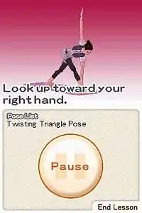 When the player selects a Yoga pose, the game offers voice and video instructions to the player to direct their pose.[2] The game does not offer a preview of the selected yoga pose before starting.[2] The game requires the player to enter in information about their completed exercises as the game has no way of measuring whether the user actually completed the exercises or not.[2]