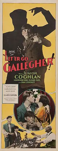 The 1928 film Let 'Er Go Gallegher included a cast with Frank Coghlan Jr., Harrison Ford, and Elinor Fair. It was directed by Elmer Clifton from a screenplay by Elliott J. Clawson. Lucien Andriot was the cinematographer and it was a Harold McLernon and Stephen Goosson production for DeMille Pictures Corporation.[2][3]