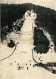 On 6 March 1969, two weeks before the competition, a hill test with trial jumper was made. Miro Oman made an inaugural jump and landed at 135 metres (443 ft).[10][11] On 21 March 1969, the first day of the KOP Ski Flying Week competition, the venue was officially opened with the first world record distance, set at 156 metres (512 ft) by Bjørn Wirkola.[12][13] The next day, the world record was tied and improved three times, by Jiří Raška (156 and 164 metres) and Bjørn Wirkola (160 metres).[14][15] On the final day of competition, in front of 45,000 spectators, Manfred Wolf set the world record at 165 metres (541 ft) in the last round. Jiří Raška won the three-day event.[16]