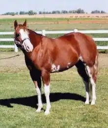 Minimally marked horses heterozygous for the Ile118Lys mutation are not uncommon: one DNA-tested Thoroughbred has white markings limited to a bottom-heavy blaze and two socks below the knee.[16] A Quarter Horse mare tested positive for the gene after she and a frame Paint stallion produced a LWS foal; the mare's markings were a thin blaze with a disconnected white spot in the right nostril, with no other white markings.[3] One major study identified two miniature horses that were completely unmarked, but were positive for the Ile118Lys gene.[9]
