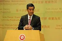 He was also a member of the National Standing Committee of the Chinese People's Political Consultative Conference and only submitted his resignation one week prior to assuming his office of the Chief Executive of Hong Kong in 2012.[6][28] He is currently the chairman and sits on the board of directors of the pro-Beijing One Country Two Systems Research Institute.[6]