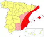 The Levante (Spanish: [leˈβante]; Catalan: Llevant [ʎəˈβan, ʎəˈvant, ʎeˈβan, ʎeˈvant]; "Levant, East") is a name used to refer to the eastern region of the Iberian Peninsula, on the Spanish Mediterranean coast. It roughly corresponds to the former Xarq Al-Andalus, but has no modern geopolitical definition. Rather, it broadly includes the autonomous communities of Valencia (provinces of Alicante, Castellón and Valencia), Murcia, Catalonia (Barcelona, Girona and Tarragona), the eastern part of Castile-La Mancha (Albacete and Cuenca), eastern Andalusia (Almería, Granada and Jaén), southern Aragon (Teruel) and the Balearic Islands.