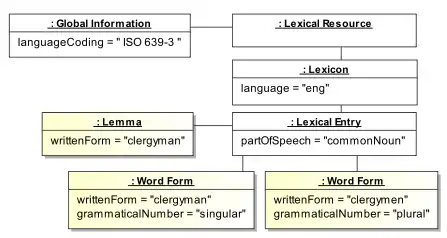 In the following example, the lexical entry is associated with a lemma clergyman and two inflected forms clergyman and clergymen. The language coding is set for the whole lexical resource. The language value is set for the whole lexicon as shown in the following UML instance diagram.