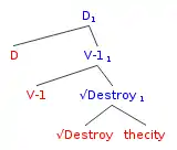 Morris Halle and Alec Marantz introduced the notion of distributed morphology in 1993.[18] This theory views the syntactic structure of words as a result of morphology and semantics, instead of the morpho-semantic interface being predicted by the syntax. Essentially, the idea that under the Extended Projection Principle there is a local boundary under which a special meaning occurs. This meaning can only occur if a head-projecting morpheme is present within the local domain of the syntactic structure.[19] The following is an example of the tree structure proposed by distributed morphology for the sentence "John's destroying the city". Destroy is the root, V-1 represents verbalization, and D represents nominalization.[19]