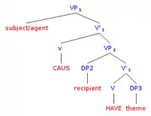 Their hypothesis shows that there is a lower verb embedded within a VP shell that combines with an upper verb (can be invisible), thus creating a VP shell (as seen in the tree diagram to the right). Most current theories no longer allow the ternary tree structure of (9a) and (9b), so the theme and the goal/recipient are seen in a hierarchical relationship within a binary branching structure.[31]