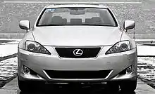 The second generation Lexus IS was the second debut of Lexus' new L-finesse design philosophy on a production vehicle, following the premiere of the 2006 Lexus GS performance sedan.[15] The new IS design featured sleeker, coupé-like contours, a fastback profile, and a repeated arrowhead motif in the front fascia and side windows based on the Japanese concept of kirikaeshi, referring to angular movements.[16] The forward design was reminiscent of the earlier Lexus LF-C coupé concept. Compared to its predecessor, the second generation IS was 3.5 inches (89 mm) longer and nearly 3 inches (76 mm) wider, largely due to a 2.3 inches (58 mm) wheelbase stretch.[15] The grille was set at a lower level than the headlights. The new IS body resulted in a 0.28 Cd figure.