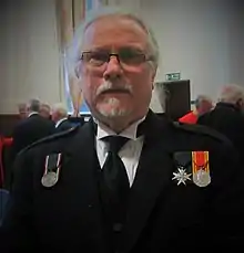 For his voluntary work with the Companions of the Sovereign Military Order of Malta in Glasgow. Scotland,[14] he was invested into the Order pro Merito Melitensi, in the grade of Silver Medal, on the feast of St John, held in the Brompton Oratory Church in London on 24 June 2016.[15][16]