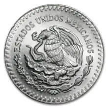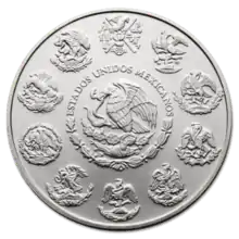 Obverse: The Coat of arms of Mexico is shown with a Mexican golden eagle perched on a prickly pear cactus devouring a rattlesnake. This imagery relates to the founding of Tenochtitlan, present-day Mexico City. The coat of arms is rooted in the legend where the god Huitzilopochtli told the Aztec people where to build their city where they saw an eagle eating a snake on top of a cactus.[1] The bottom half of the coat of arms has oak and laurel leaves encircling the eagle. The top half has the words Estados Unidos Mexicanos (United Mexican States) encircling the eagle. The gold obverse has not changed since its inception and the silver coin had the same obverse at its inception. In 2000, the silver obverse was changed to depict the current Mexican national coat of arms along with 10 past versions of this symbol surrounding it. The Spanish inscription ESTADOS UNIDOS MEXICANOS still surrounds the central coat of arms.[2] The past version of the symbol at the top is found in the Codex Mendoza from 1524.