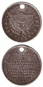 Vast amounts of promotional materials were manufactured. For example, for the third Liberty Loan nine million posters, five million window stickers and 10 million buttons were produced and distributed.[12] The campaign spurred community efforts across the country and resulted in glowing, patriotically-tinged reports on the "success" of the bonds.[13] For the fifth and final loan drive (the Victory Loan) in 1919 the Treasury Department produced steel medallions made from melted down German cannon that had been captured by American troops at Château-Thierry in NW France. The inch-and-a-quarter wide medallions suspended from a red, white, and blue ribbon were awarded by the Department to Victory Liberty Loan campaign volunteers in appreciation of their service in the drive.