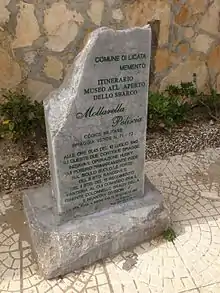 Licata.[10] served as an Allied landing point during the 1943 Operation HUSKY Allied invasion of Sicily of World War II.[11] War damage and the decline in competitiveness in the sulphur industry caused economic decline, forcing many people to emigrate to northern Italy or abroad. As a town occupied by the Allies, it served as a model for John Hersey's novel A Bell for Adano.[12]