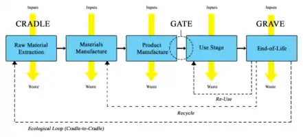 Life-cycle assessment (LCA) is sometimes referred to synonymously as life-cycle analysis in the scholarly and agency report literatures.[5][1] Also, due to the general nature of an LCA study of examining the life cycle impacts from raw material extraction (cradle) through disposal (grave), it is sometimes referred to as "cradle-to-grave analysis".[4]