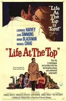Life at the Top is a 1965 drama film, a production of Romulus Films released by Columbia Pictures. The screenplay was by Mordecai Richler, based on the novel Life at the Top by John Braine, and is a sequel to the film Room at the Top (1959). It was directed by Ted Kotcheff and produced by James Woolf with William Kirby as associate producer. The music score was by Richard Addinsell and the cinematography by Oswald Morris. The film's art director Edward Marshall received a 1966 BAFTA Award nomination.[1]