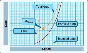 Lift-induced drag is a component of total drag that occurs whenever a finite span wing generates lift. At low speeds an aircraft has to generate lift with a higher angle of attack, thereby resulting in a greater induced drag. This term dominates the low-speed side of the graph of lift versus velocity.