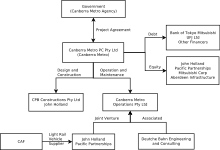 - Canberra Metro: Pacific Partnerships, Mitsubishi Corporation, John Holland, CAF, Deutsche Bahn, Aberdeen Asset Management, Leighton Contractors, and Bank of Tokyo-Mitsubishi[23]