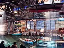 After the pre-show, the audience, still keeping to their 3 separate rows, enter the main sound stage, which is modeled after the interior of a boathouse in New York City. Once the command to roll cameras has been given, the sky (a projection of the NYC skyline outside the boathouse windows) darkens, thunder and lightning fill the room, heavy rain pours through the ceiling, and the audience is immersed in various effects such as strong wind, intense fire, signboards crashing through the roof, the boathouse windows blowing away, movement of the platform they are standing on, and a huge cargo ship slamming through the boathouse entrance. This part of the show lasts approximately 3 minutes. Once the show is over, the audience exit the sound stage and emerge into the New York zone of the theme park.