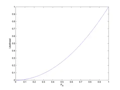 Hence, given the observed data HH, the likelihood that the model parameter equals 0.5 is 0.25. Mathematically, this is written as