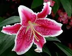 Lilium 'Stargazer' (the 'Stargazer lily') is a hybrid lily of the 'Oriental group'. Oriental lilies are known for their fragrant perfume, blooming mid-to-late summer. Stargazers are easy to grow and do best in full sunlight.[1] They have a fast growth rate and should be planted in full sun in well-drained loamy or sandy soil. When mature, 'Stargazers' can grow to a height of 36 inches with a spread of 10 to 14 inches with 2 to 8 flowers per stem.[2]