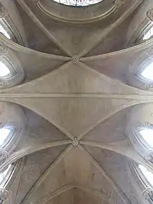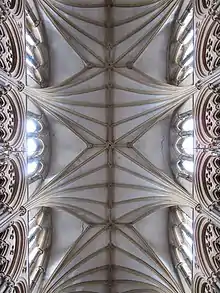 Saint Hugh's Choir exhibits extremely unusual vaults. It is a series of asymmetrical vaults that appear to almost be a diagonal line created by two ribs on one side translating into only a single rib on the other side of the vault. This pattern divides up the space of the vaults and bays, perfectly placing the emphasis on the bays. The chapter house vaults are also interesting. It is a decagonal building with a single, central column that twenty ribs rise from. Each separate area of Lincoln can be identified solely by the different vaults of the space. Each vault, or each variation of the vault, is fresh and original. The vaults are attributed to French-Normand master mason Geoffrey de Noiers.[24][25] de Noiers was succeeded by Alexander the Mason, who developed the nave's more elaborate, but symmetrical tierceron vaulting, the crossing vaulting, Galilee Porch and western facade screen.[26][27]