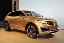The Lincoln MKX made its first appearance as the Lincoln Aviator concept vehicle at the 2004 North American International Auto Show as a successor to the first generation Aviator. The concept vehicle was smaller and more car-like with a V6 that was rated at 245 hp (183 kW) and 240 lb⋅ft (330 N⋅m). The Aviator Concept also differed from the production model stylistically and with its panoramic sunroof. The production model received the MKX nameplate, with Lincoln management suggesting a "mark ex" pronunciation during the 2006 auto show circuit, which was then changed to the phonetic M-K-X.[6] Due to the similarity of the MKX name to the MDX name used by Acura for their competing luxury crossover, Honda, Acura's parent company, filed a lawsuit against Ford in January 2006, eventually settling the case out of court.[7]