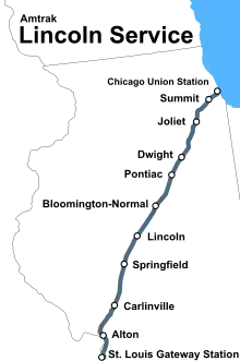The Lincoln Service is a 284-mile (457 km) higher-speed rail service operated by Amtrak that runs between Chicago, Illinois and St. Louis, Missouri. The train is a part of the Illinois Service and is partially funded by the Illinois Department of Transportation. The train uses the same tracks as the long-distance Texas Eagle.