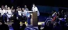 Whalen amusing the audience at Lindsay Whalen Day in 2018
