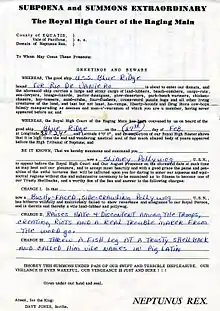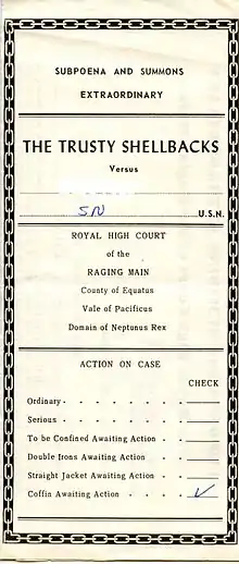 After crossing the line, Pollywogs receive subpoenas[14] to appear before King Neptune and his court (usually including his first assistant Davy Jones and her Highness Amphitrite and often various dignitaries, who are all represented by the highest ranking seamen), who officiate at the ceremony, which is often preceded by a beauty contest of men dressing up as women, each department of the ship being required to introduce one contestant in swimsuit drag. Afterwards, some may be "interrogated" by King Neptune and his entourage, and the use of "truth serum" (hot sauce + after shave) and whole uncooked eggs put in the mouth. During the ceremony, the Pollywogs undergo a number of increasingly embarrassing ordeals (wearing clothing inside out and backwards; crawling on hands and knees on nonskid-coated decks; being swatted with short lengths of firehose; being locked in stocks and pillories and pelted with mushy fruit; being locked in a water coffin of salt-water and bright green sea dye (fluorescent sodium salt); crawling through chutes or large tubs of rotting garbage; kissing the Royal Baby's belly coated with axle grease, hair chopping, etc.), largely for the entertainment of the Shellbacks.