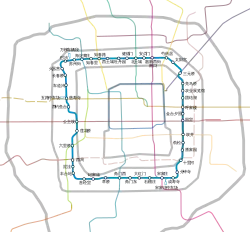 Line 10 of the Beijing Subway (Chinese: 北京地铁10号线; pinyin: běijīng dìtiě shíhào xiàn) is the second loop line in Beijing's rapid transit network as well as the longest and most widely used line. The line is 57.1 km (35.5 mi) in length and runs entirely underground through Haidian, Chaoyang and Fengtai Districts, either directly underneath or just beyond the 3rd Ring Road.[3] The Line 10 loop is situated between two and six kilometers outside the Line 2 loop, which circumnavigates Beijing's old Inner City. Every subway line through the city centre intersects with Line 10, which has 24 transfer stations along route, and 45 stations in all.[3] Line 10's color is Capri.
