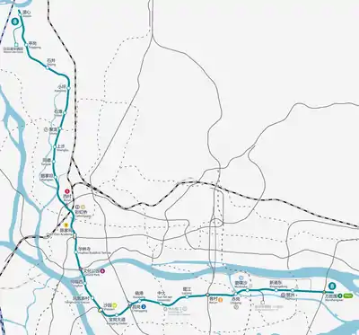 Line 8 of the Guangzhou Metro is a north-west L-shaped line on the system that runs from Jiaoxin to Wanshengwei, spanning a total of 33.9 km (21.1 mi)[3] with 26 stations. It interchanges with Line 1 at Chen Clan Academy, Line 2 at Changgang, Line 3 at Kecun, Line 4 at Wanshengwei and Line 6 at Cultural Park. All stations on Line 8 are underground.[4] Line 8's color is teal.