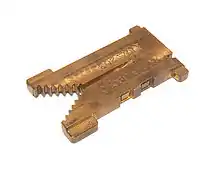 The ejector is a stacked series of narrow blades that push the completed slug from the mold aperture in the mold disk. The blades are narrow enough to pass through a mold set to 6-points in thickness with .004" clearance between the fixed mold face and the left side of the blades. The blades are each 2 picas in width and the number of blades engaged on ejection are set based on the line length being cast. All blades are engaged for a 30 pica slug, fewer are engaged as the measure of the slug body is narrowed by the use of progressively longer mold liners. This prevents the ejector blades from striking the back of a mold liner on narrow slugs. As the slug is pushed from the mold, the slug passes a set of knife edges in the knife block, which trims off any small irregularities in the casting and produces a slug of exactly the desired point thickness. From there, the slug drops into the galley tray which holds the lines in the order in which they were cast.[22]